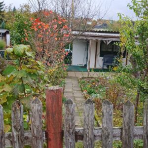 Zum Kleingarten gehört eine Laube und ein Gewächshaus.